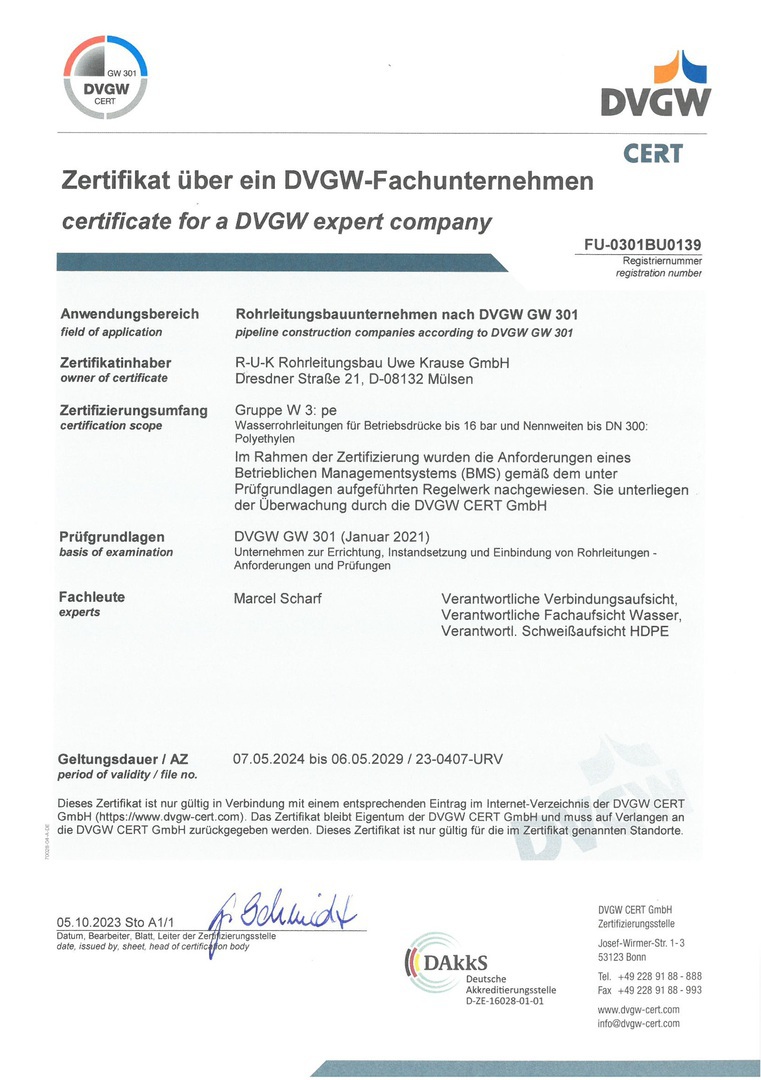 Rohrleitungsbauunternehmen nach DVGW GW301
